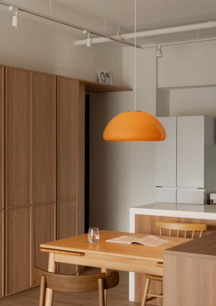從鞋櫃轉折至餐廳,內凹圓弧的設計柔化了走道的壓迫,是一道不著痕跡的轉場。木質牆面一路延伸至天花,框出一個溫潤的門洞,引導我們轉換心境至放鬆舒適的狀態。