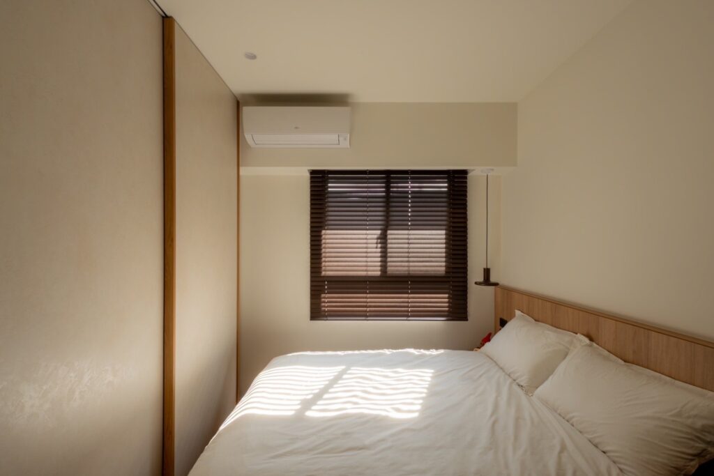 主臥延續簡約風格,衣櫃以木作滑門結合系統板,預留取手縫的設計,提升視覺整潔度與使用便利。