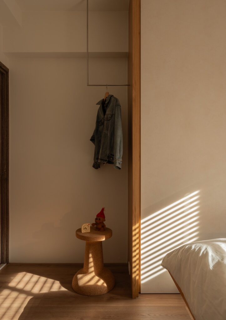 為了兼顧造型與結構穩固,掛衣桿的安裝上也特別講究。將五金預埋於木作結構內避免外露螺絲,再以面材修飾表面,讓衣桿與天花、木作的接合處乾淨俐落,即使打開衣櫃,內部也不見五金痕跡,細節中藏著對美感與實用的細膩拿捏。