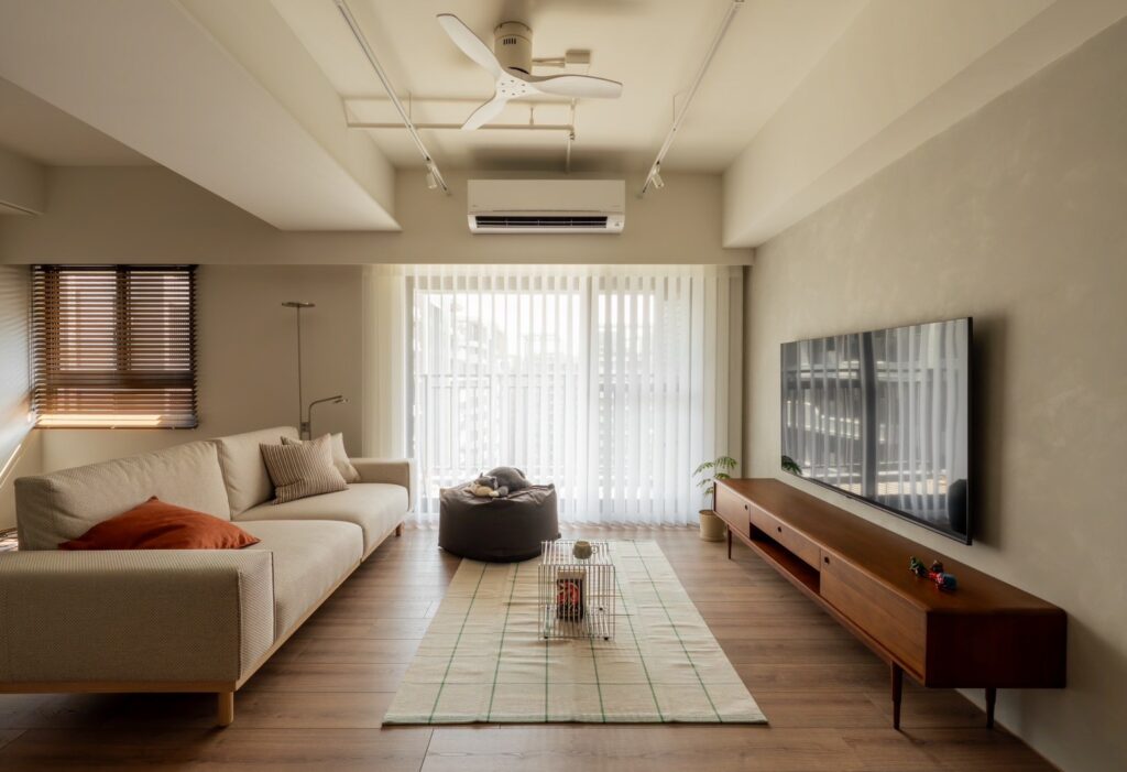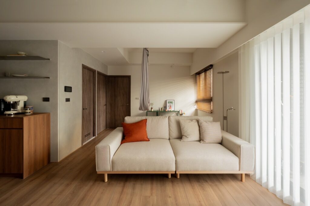 客廳後方特別安排了空中瑜伽掛布,那份懸浮中的穩定感,正好也呼應了整體家具選擇中的拿捏與平衡,讓這個家在視覺與身心上,都感受到剛好的舒適。
