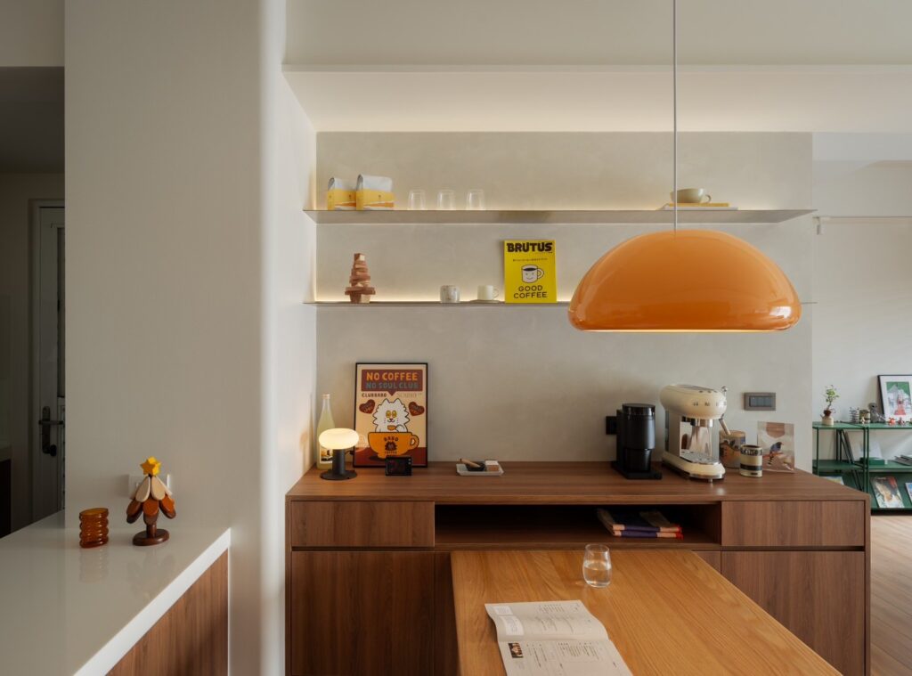 裸鐵層架像是撐起生活的骨架,上方擺著咖啡機與喜愛的小物,下方柔和的間接照明把每個平凡的日常都襯托得剛剛好。