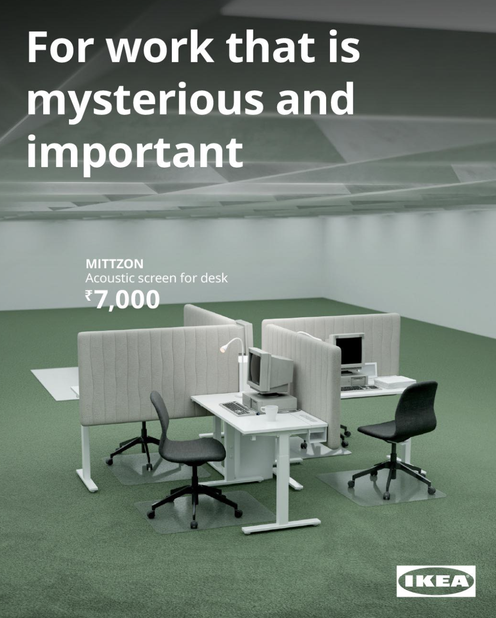 中心擺了一組四人共用的辦公桌,搭配金屬材質的文件及與隔板,與背靠較低、泡棉厚墊的辦公椅。IKEA也搭上這組lumon風潮,在社群上分享了辦公桌組。